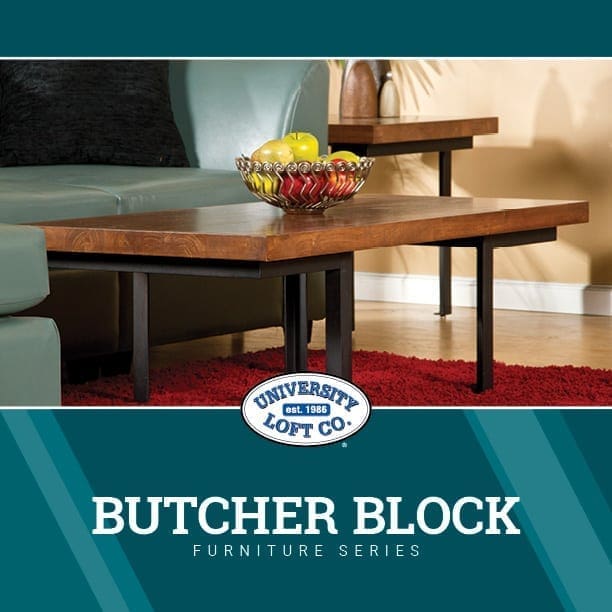 Taking a cut from the Butcher shop, our Butcher Block Series features beautiful thick wood on top of sleek metal. These pieces will make any apartment or living space a feel upscale.
