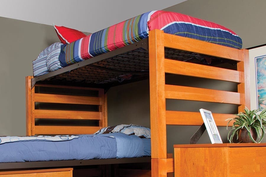 Having too much in one space really is a happy problem. What makes that problem even happier is a solution, and University Loft has just that in our modular furniture. Our space-friendly furniture can be arranged in a student’s room to best fit the available area. There are a vast amount of possible configurations too. With our Tool-Less System™, it is easy to make any necessary (or unnecessary) changes to the furniture arrangement. You can adjust the position of the bed between 11 height settings, place the spring or bedrail over steel dowels and tap with your hands to lock it in place. No tools necessary.