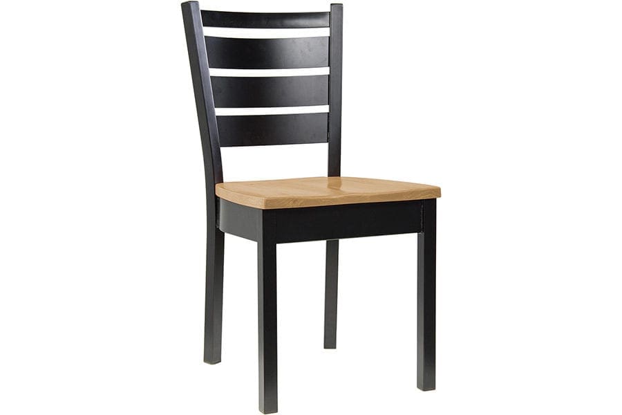 Metal dining chair with straight legs and wood seat. Shown in Cafelle with Kessler Silver accents.
